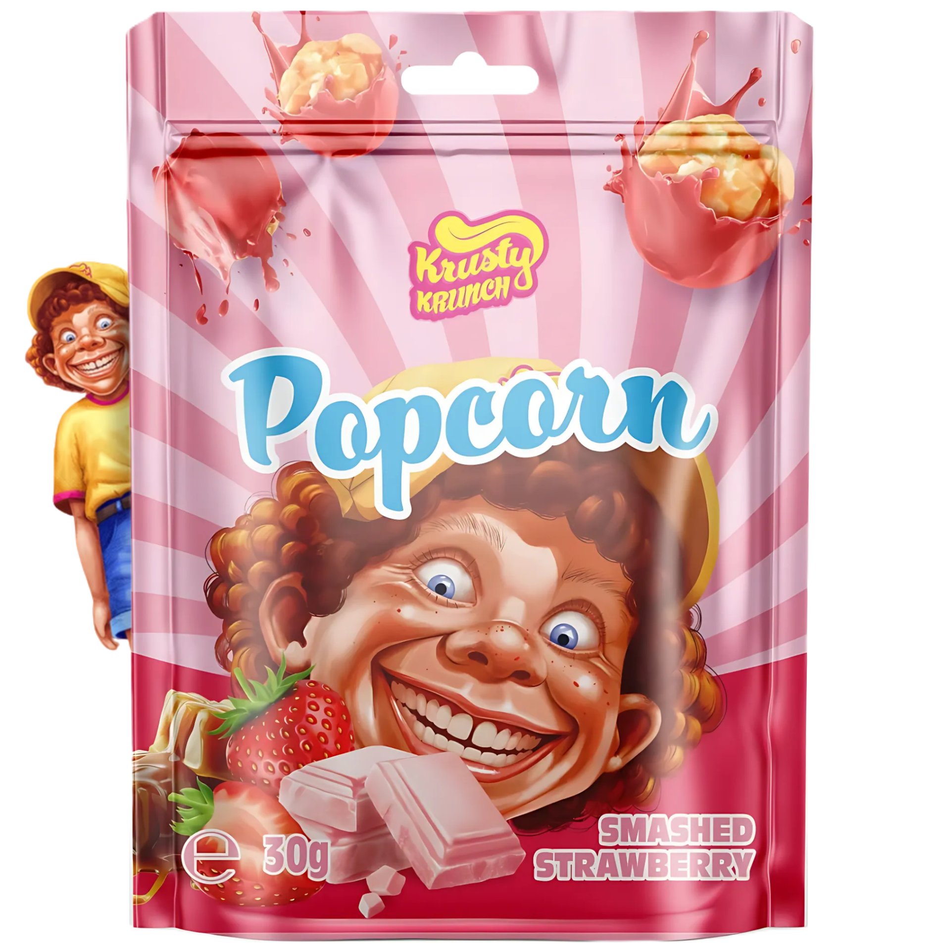 Krusty Krunch - Smashed Strawberry Popcorn 30 g vereint zartes Karamell-Popcorn mit cremiger weisser Schokolade auf Kakaobutterbasis und fruchtigem Erdbeerpulver. Der süsse Geschmack reifer Erdbeeren trifft auf knackiges Popcorn, somit ein unwiderstehlicher Snack. Zutatenbasiert ist das Produkt als HALAL einzustufen, jedoch ohne offizielle HALAL-Zertifizierung.