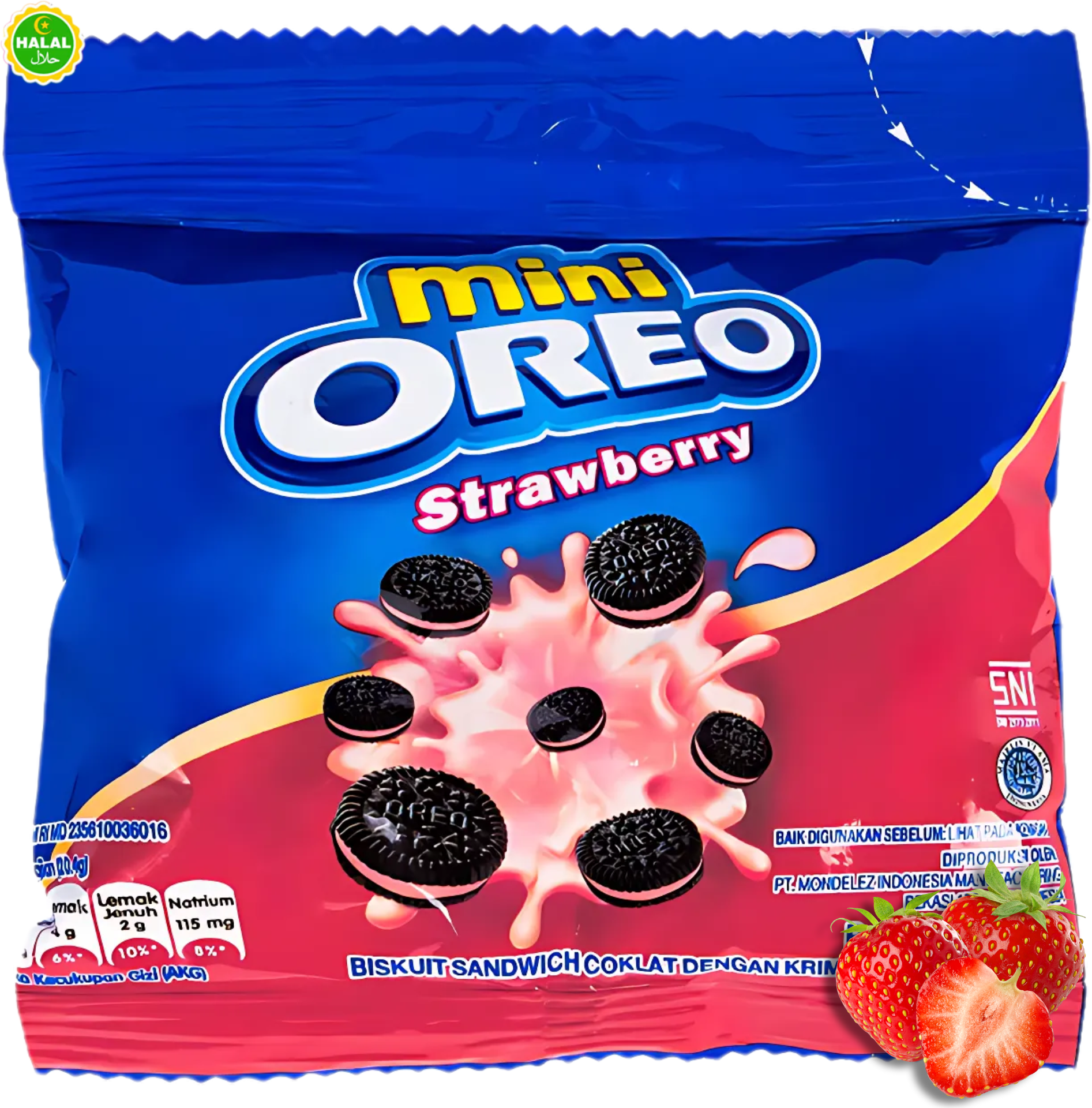 OREO - Mini Strawberry Pouch HALAL 20.4 g vereinen den beliebten knusprigen Oreo-Kakaokeks mit einer fruchtig-süssen Erdbeercremefüllung. Im Mini-Format sind sie perfekt für unterwegs. HALAL-zertifiziert und damit für jeden Genussmoment geeignet.