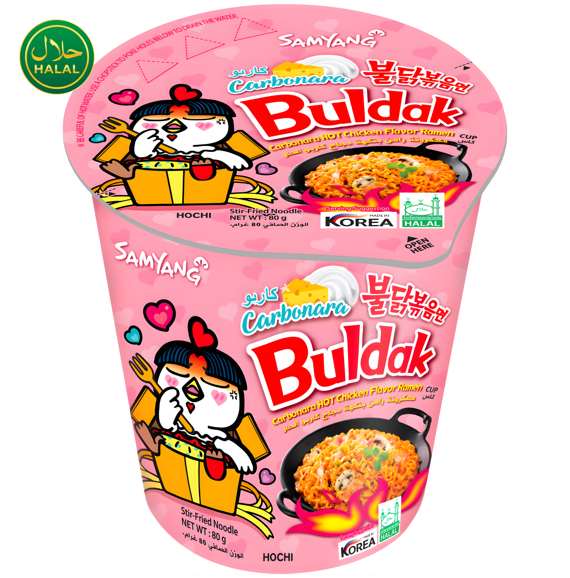 SAMYANG - Buldak Carbonara Hot Chicken Flavor Ramen Cup HALAL 80 g kombiniert die legendäre koreanische Buldak-Schärfe mit einer cremigen Carbonara-Note. Die würzigen Instantnudeln überzeugen mit einer intensiven Chili-Schärfe, die durch eine cremige Käse-Carbonara-Sauce harmonisch abgerundet wird. HALAL-zertifiziert und damit für jeden Genussmoment geeignet.