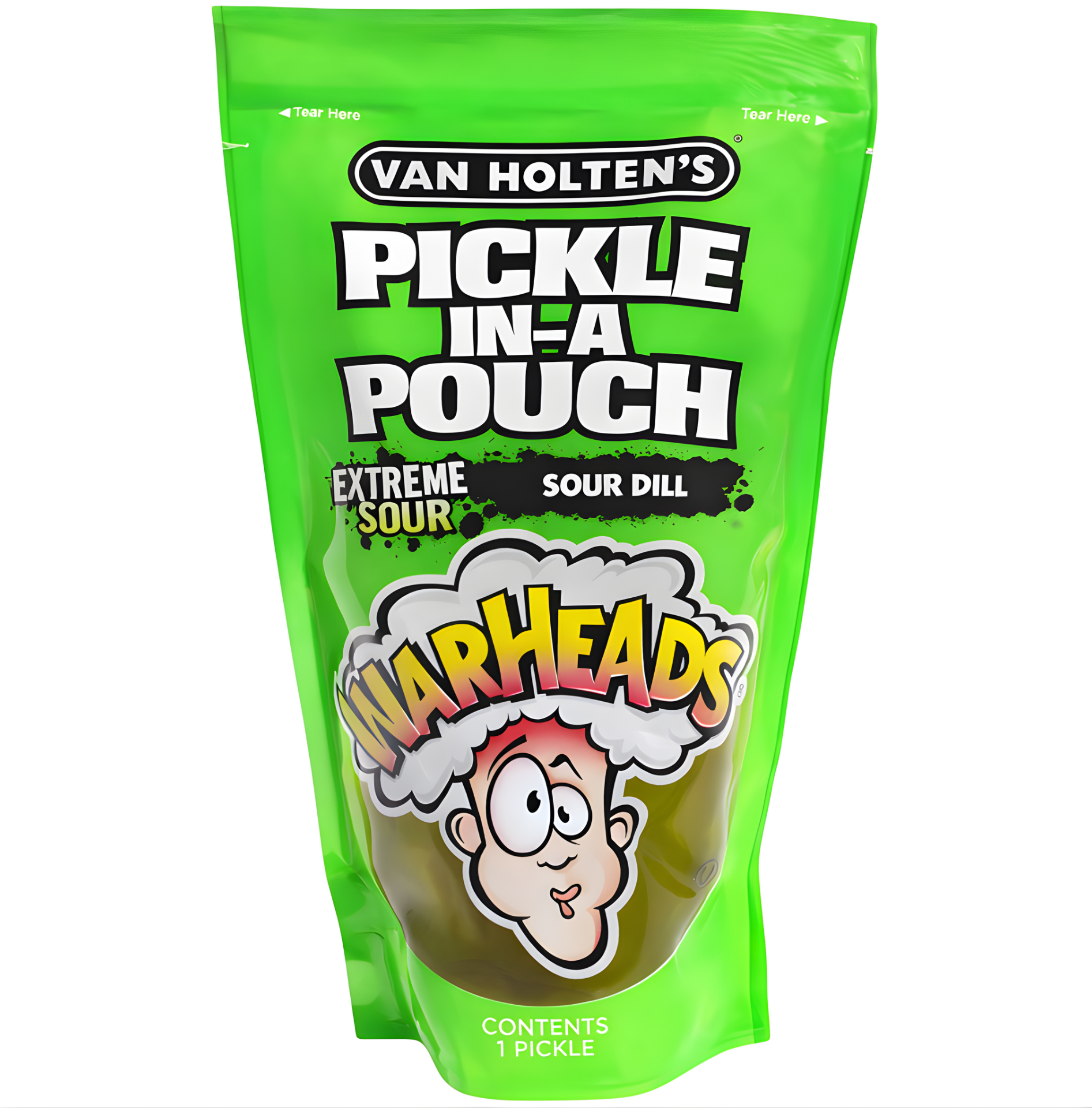 VAN HOLTEN'S - Warheads Pickle-in-a-Pouch 242 g ist eine extra saure, einzeln verpackte Gewürzgurke mit intensivem Warheads-Sour-Geschmack. Die knackige Textur trifft auf eine explosive Säure, die Fans von extrem sauren Snacks begeistert.