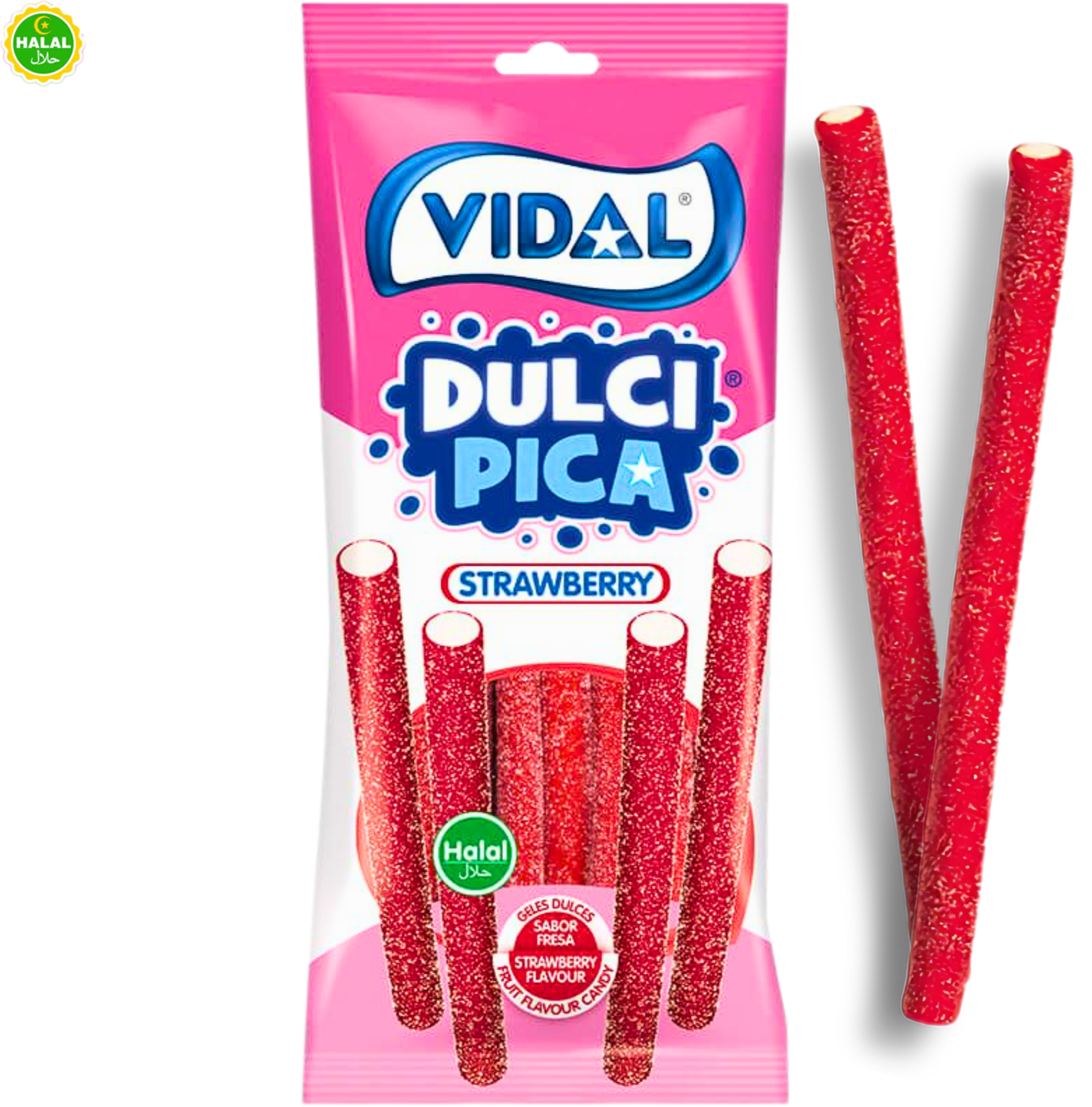 VIDAL - Dulci Pica Strawberry HALAL 90 g bringt dir süss-saure Erdbeer-Stangen mit prickelndem Zuckerüberzug. Aussen herrlich sauer und innen weich gefüllt. HALAL-zertifiziert und damit für jeden Genussmoment geeignet.