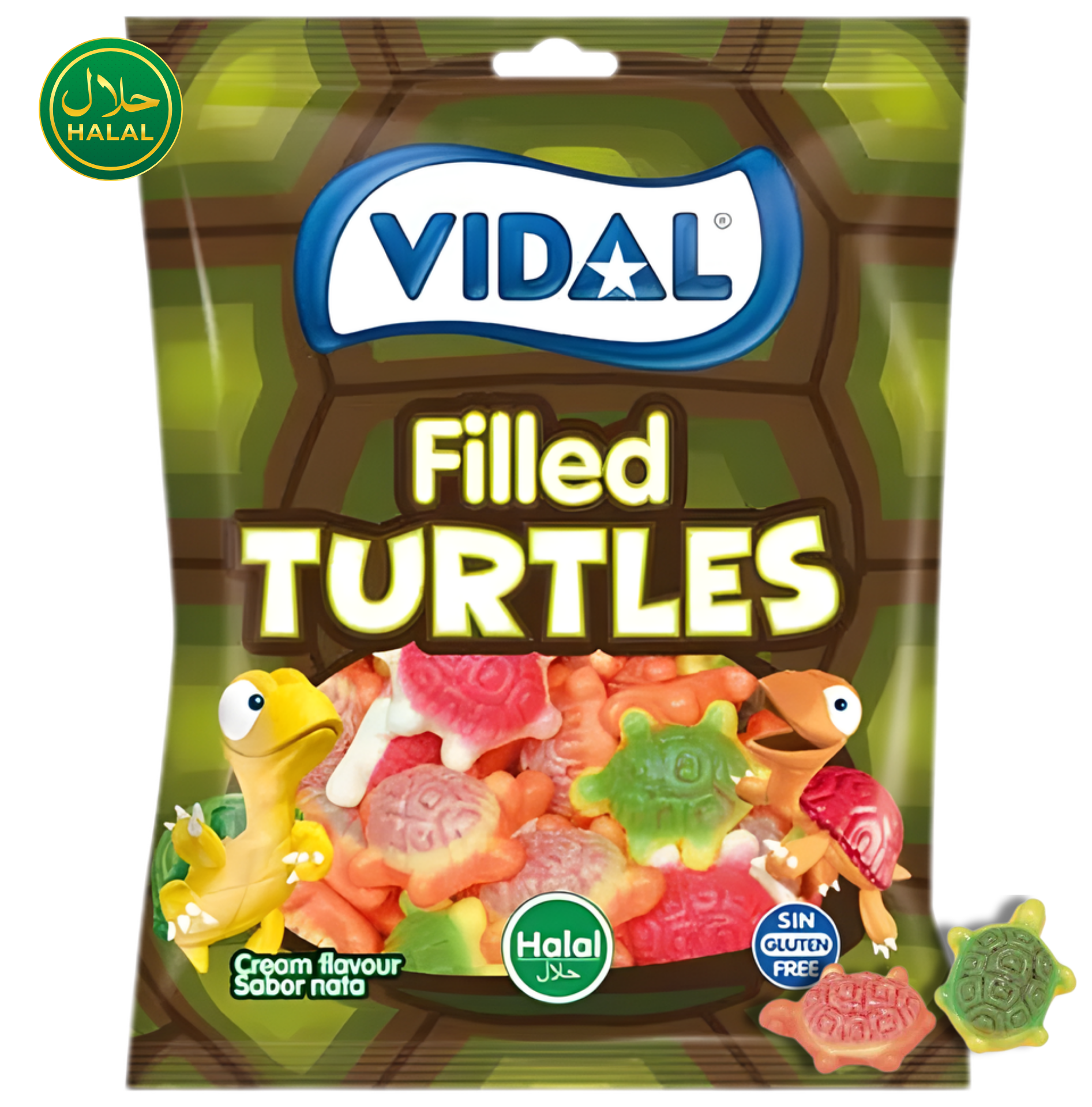 VIDAL - Filled Turtles HALAL 90 g begeistern dich mit ihrer verspielten Schildkrötenform, einer weichen Fruchtgummi-Hülle und einer fruchtigen Füllung, die beim Reinbeissen für ein intensives Geschmackserlebnis sorgt. HALAL-zertifiziert und damit für jeden Genussmoment geeignet.