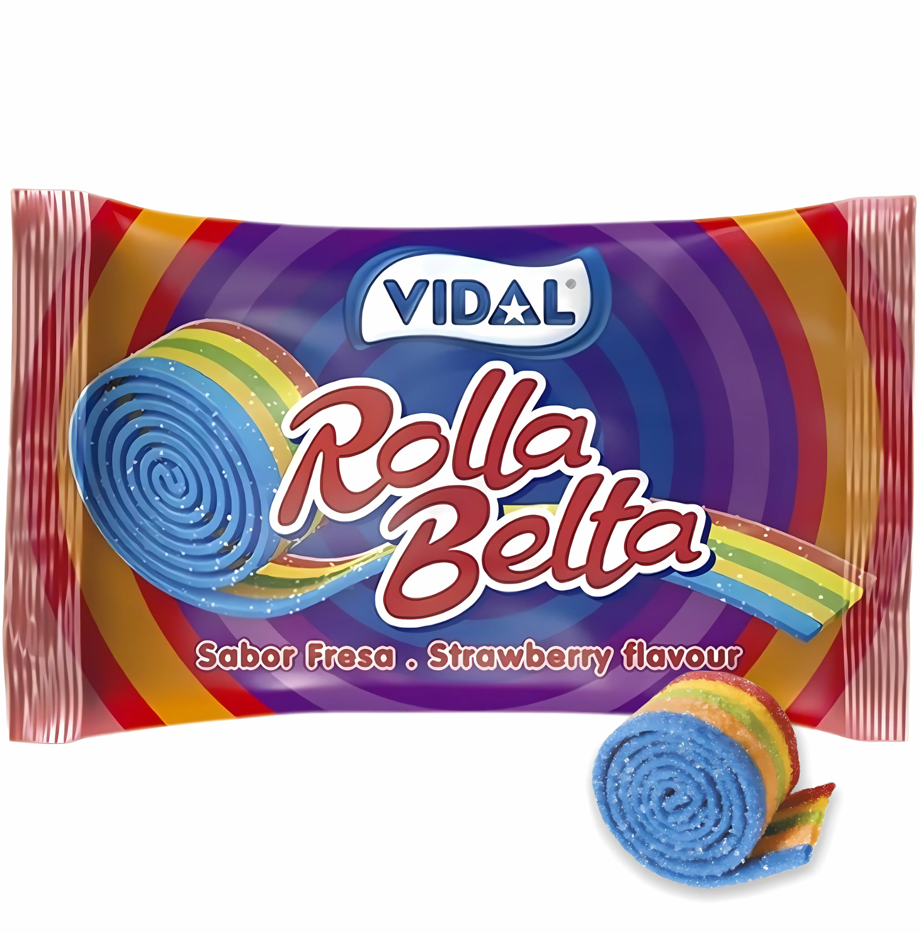 VIDAL - Rainbow Rolla Belta 19 g sind fruchtige Kaustreifen in Regenbogenoptik, zusammengerollt wie ein süsses Bändel. Überzogen mit Zuckerkruste bieten sie ein spritzig-fruchtiges Geschmackserlebnis.