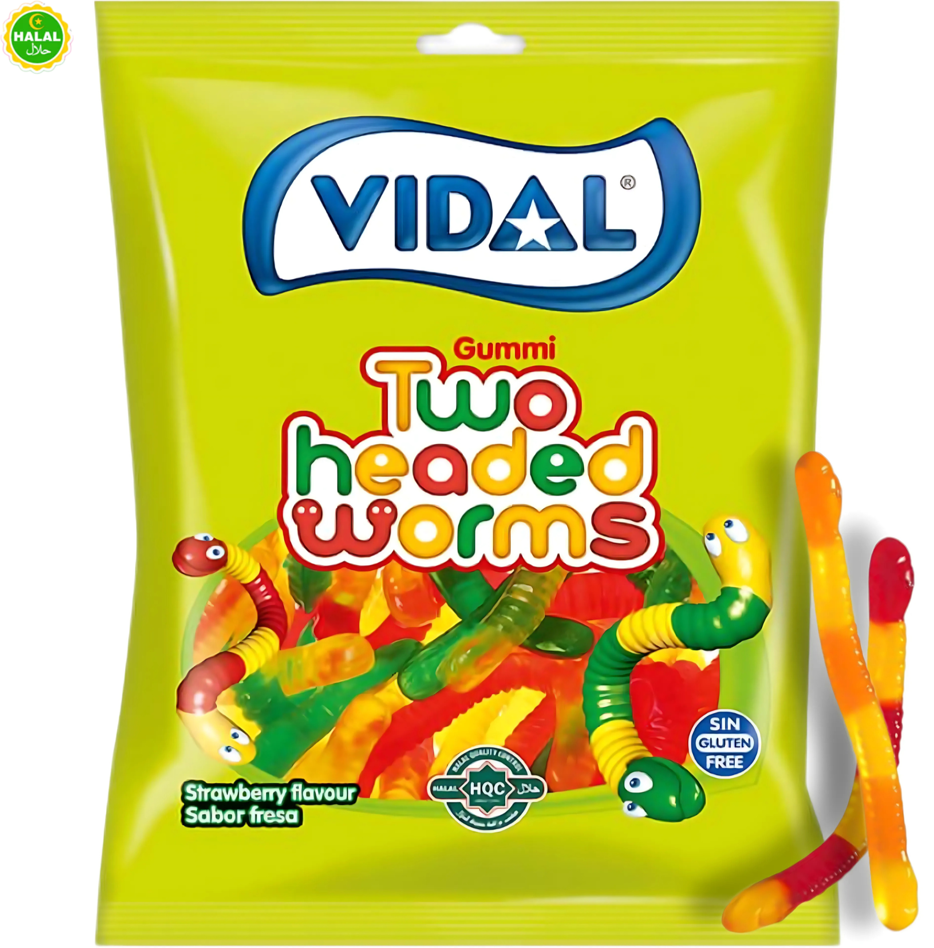 VIDAL - Two Headed Worms HALAL 90 g bringen dir doppelten Spass in jedem Biss! Die farbenfrohen Fruchtgummis mit zwei Geschmacksrichtungen in einem Wurm überraschen dich mit intensiven, fruchtigen Aromen. HALAL-zertifiziert und damit für jeden Genussmoment geeignet.