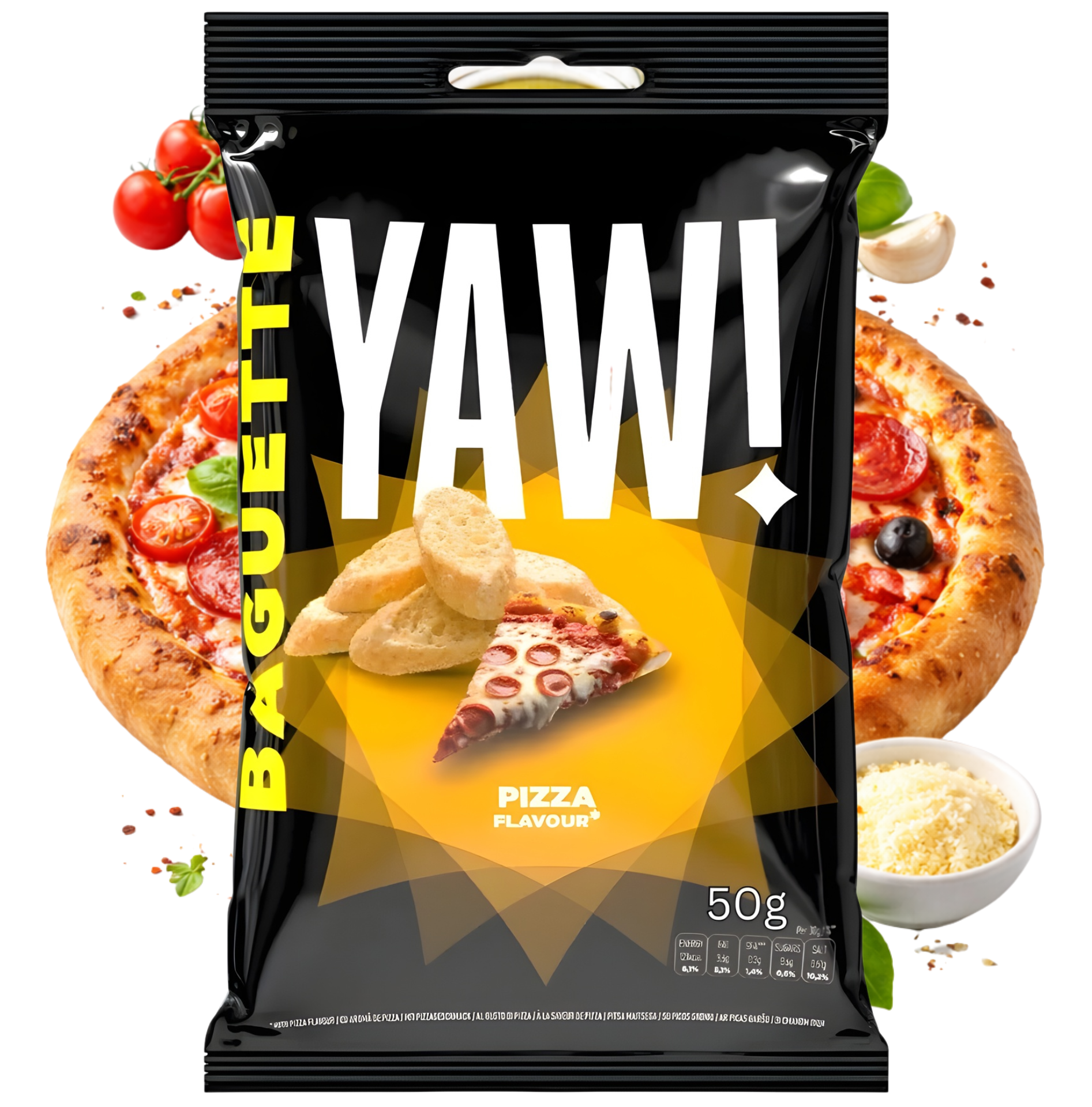 YAW! - Baguette-Snack Pizza Flavour 50 g bietet dir knusprige Snackstücke im Baguette-Stil mit würzigem Pizza-Geschmack. Die Kombination aus aromatischen Gewürzen und knuspriger Textur sorgt für ein intensives und herzhaftes Geschmackserlebnis, das an frisch gebackene Pizza erinnert.